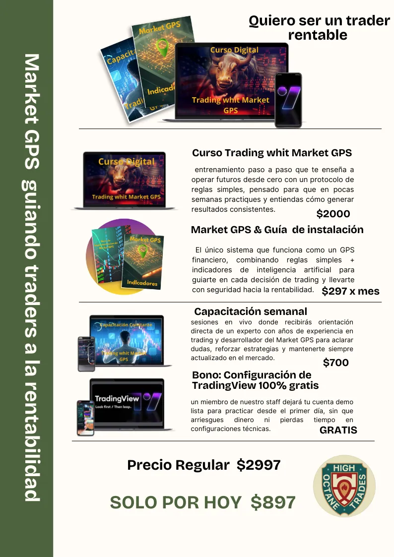 Somos High Octane Trades creadores de Market GPS, y de un sistema educativo creado por traders para traders, diseñado para guiarte con reglas simples y precisión de inteligencia artificial.